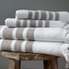 Pestemal (pesh-te-mahl) n. The traditional flat-woven towel used in the legendary Turkish bath. Famous for its absorbency and softness, it is perfectly suited for everyday use. It is hand-loomed of 100% Turkish cotton with hand-tied fringe.