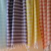 Pestemal?(pesh-te-mahl) n. The traditional flat-woven towel used in the legendary Turkish bath. Famous for its absorbency and softness, it is perfectly suited for everyday use. It is hand-loomed of 100% Turkish cotton with hand-tied fringe.?